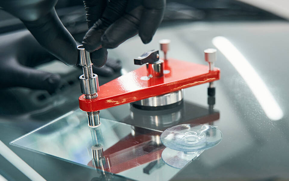 飛び石などで傷付いたガラスの修理には、ひび割れの中に入ってしまった空気を抜き、レジンを入れる作業を行います。
